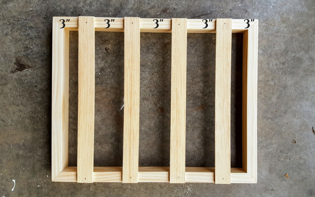 Position the top and bottom slats 3″ from the top and bottom of the frame, and space the middle slats 3″ apart from center-to-center. Attach with wood glue and finish nails.