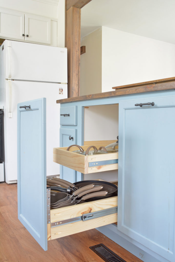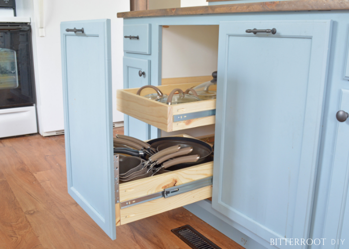 Let me tell ya, I searched long and hard for ideas for kitchen cabinet organization ideas when I was putting the kitchen island together. The island is 5′ wide and 23″ deep, so it added a lot of cabinet space to the kitchen and I wanted to use it all as efficiently as possible. We used to have a pots and pans drawer in our previous house and liked the convenience. After installing the Rev-a-Shelf garbage and recycling pullout in one side of the island, I figured I could rig up something similar for the pots & pans on the other side. There are a ton of pots and pans storage drawers, but you usually have to open the cabinet door all the way before extending the drawer.