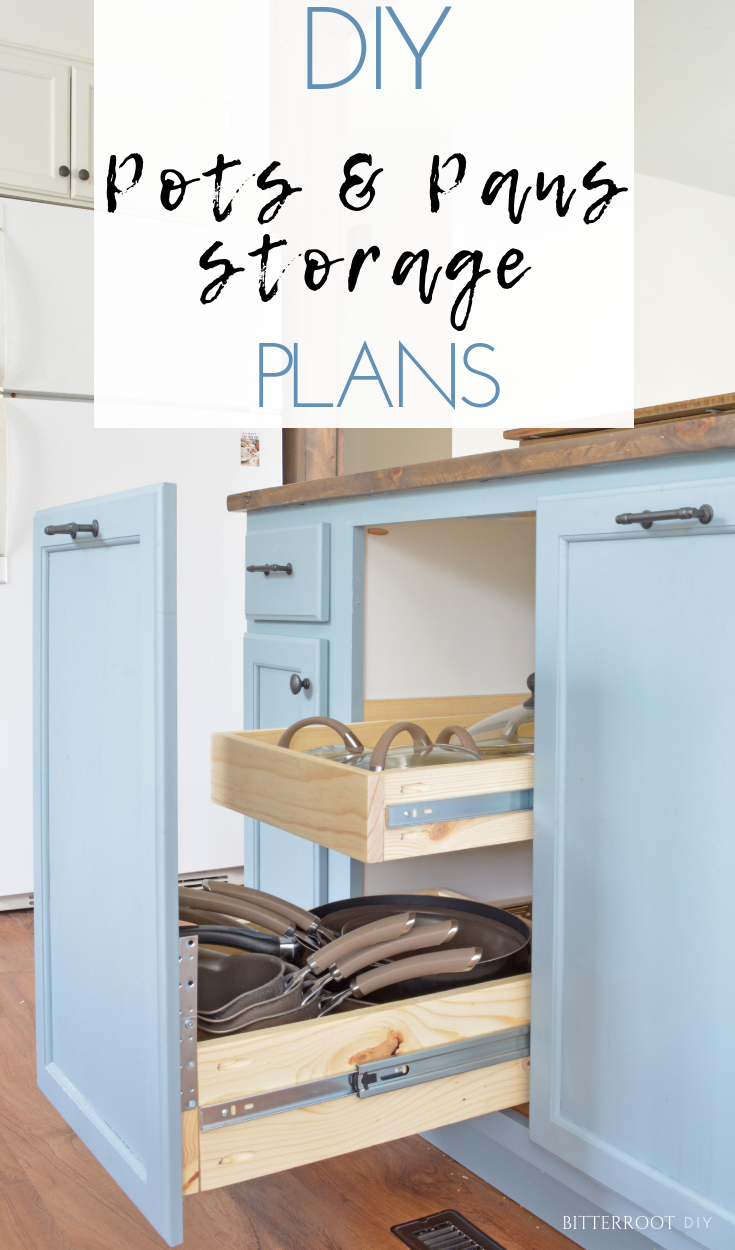 I placed the bottom drawer juuuuust above the bottom of the cabinet and placed the lid drawer 16″ above the bottom of the cabinet. Adjust as necessary to fit your cabinet, as well as your pots and pans.
