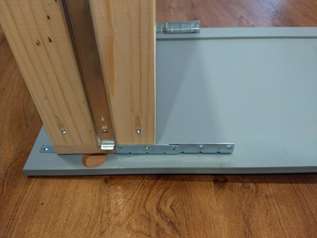 Attach the long right angle corner brace to the side of the drawer and then to the cabinet.