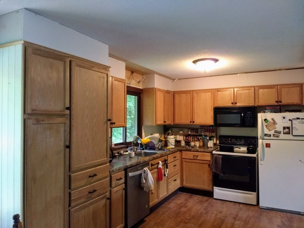 I mud and taped the new tops of the cabinets, scraped the texture off the ceiling, patched and repainted everything, and added new can lights.