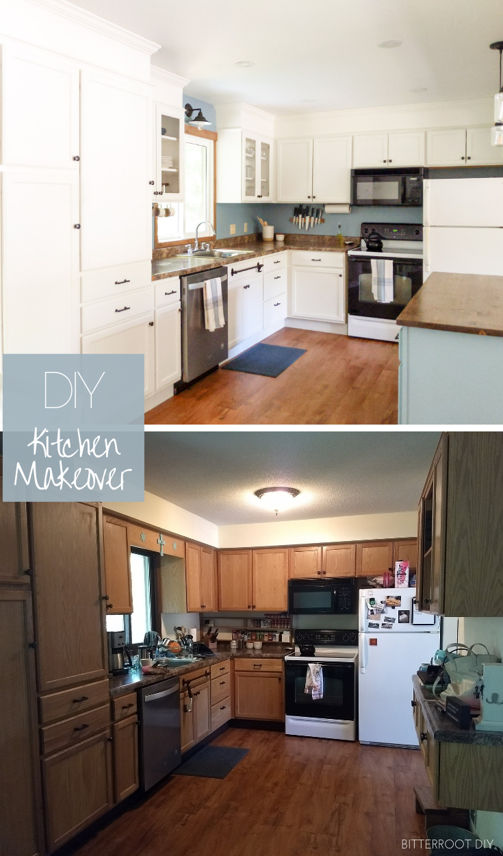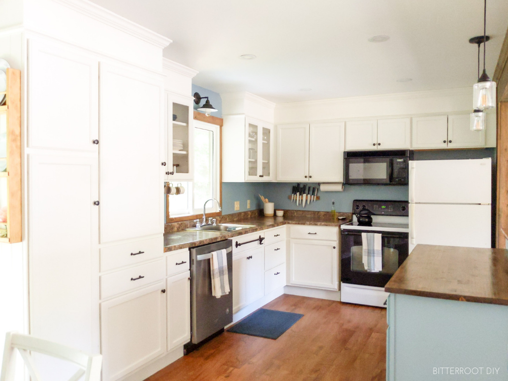 Well I think the best advice I can give (besides doing it DIY style) is to pick the things that give you the best bang for your buck. I would LOVE to replace our countertops – just wasn’t in the budget for now. However, the bright white cabinets almost make the counters look new as is! I also really wanted to tile the backsplash – couldn’t make it happen this time. Replacing all the appliances with that new gooorgeous black stainless stuff from Home Depot – hopefully in a couple few years …
